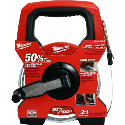 Milwaukee open reel long tapes deliver on best in class accuracy and durability. Both offer nylon bond steel blades that have minimal stretch, and wont kink or tear from abusive conditions. Milwaukee long tapes have industry's first debris wiper, Grime Guard, that prevents dirt, dust and debris from entering the tape, causing jams. Furthermore, reinforced 3:1 metal planetary gears and metal handle guarantees durability in the toughest jobsite conditions.