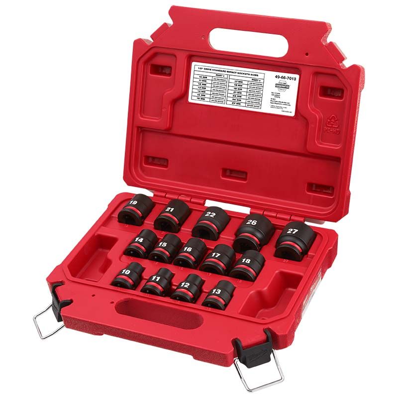 The Milwaukee SHOCKWAVE Impact Duty 1/2" Drive 6 Point Socket Sets feature the boldest, longest-lasting markings and extreme impact durability in high torque applications. The stamped and ink-filled size marking enables you to select the right socket every time throughout the life of the socket. These sockets are engineered with high strength forged steel for optimized performance in heavy-duty applications. The non-slip hex geometry prevents fastener rounding, and a dual-hole design and ring groove allow for easy socket attachment and removal. All Milwaukee SHOCKWAVE Impact Duty Sockets meet ASME industry standards. These 1/2" Drive 6 Point Socket Sets include either a customizable Socket Rail or an impact-resistant storage case.