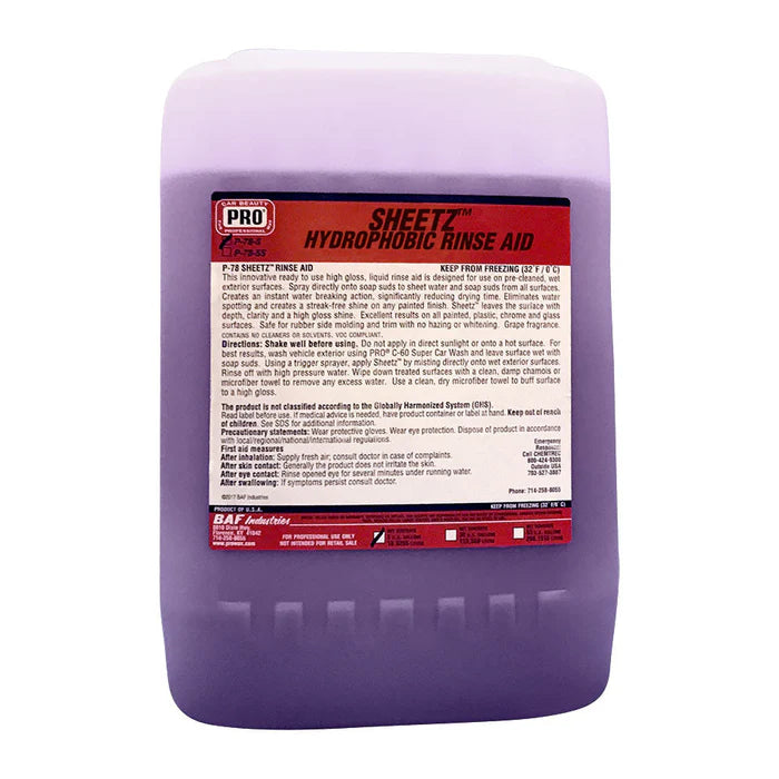 This innovative ready to use high gloss, liquid rinse aid is designed for use on pre-cleaned, wet exterior surfaces. Spray directly onto soap suds to sheet water and soap suds from all surfaces. Creates an instant water breaking action, significantly reducing drying time. Eliminates water spotting and creates a streak-free shine on any painted finish. Sheetz leaves the surface with depth, clarity and a high gloss shine. Excellent results on all painted, plastic, chrome and glass surfaces. Safe for rubber side molding and trim with no hazing or whitening. Grape fragrance. CONTAINS NO CLEANERS OR SOLVENTS.